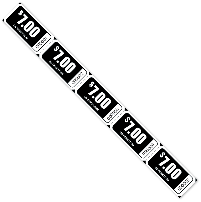 $7.00 Denomination Strip tickets printed in color on bright white card stock. Five tickets per strip, 100 strips per booklet. Sequentially numbered.