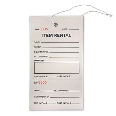 2 Part Item Rental Tag with String. 3.25in x 5.75in 10pt durable cardstock with pre-strung heavy duty elastic string and a perforated claim check. Each tag portion is sequentially numbered. Custom tag and tickets are available, contact us to find out more!