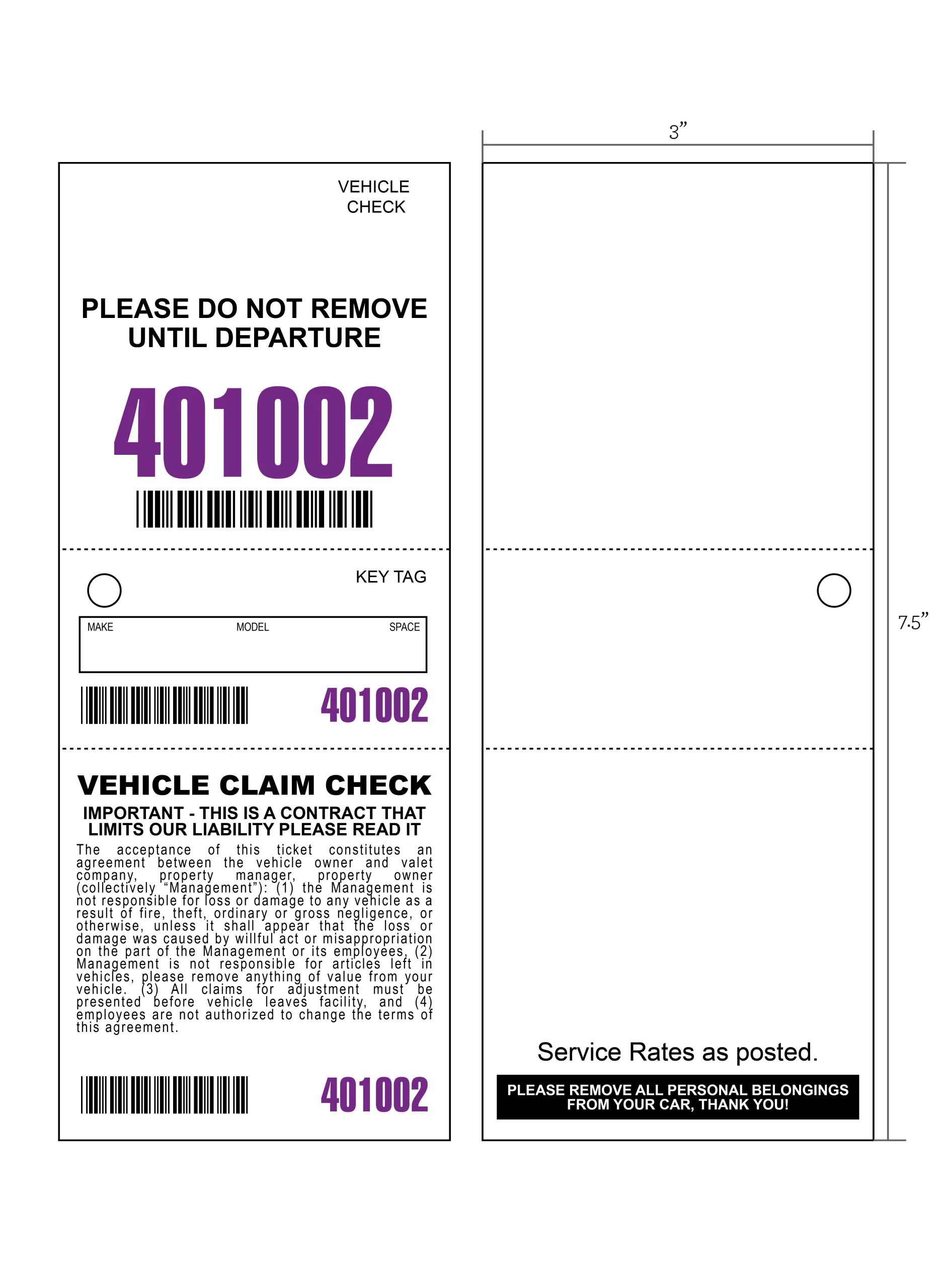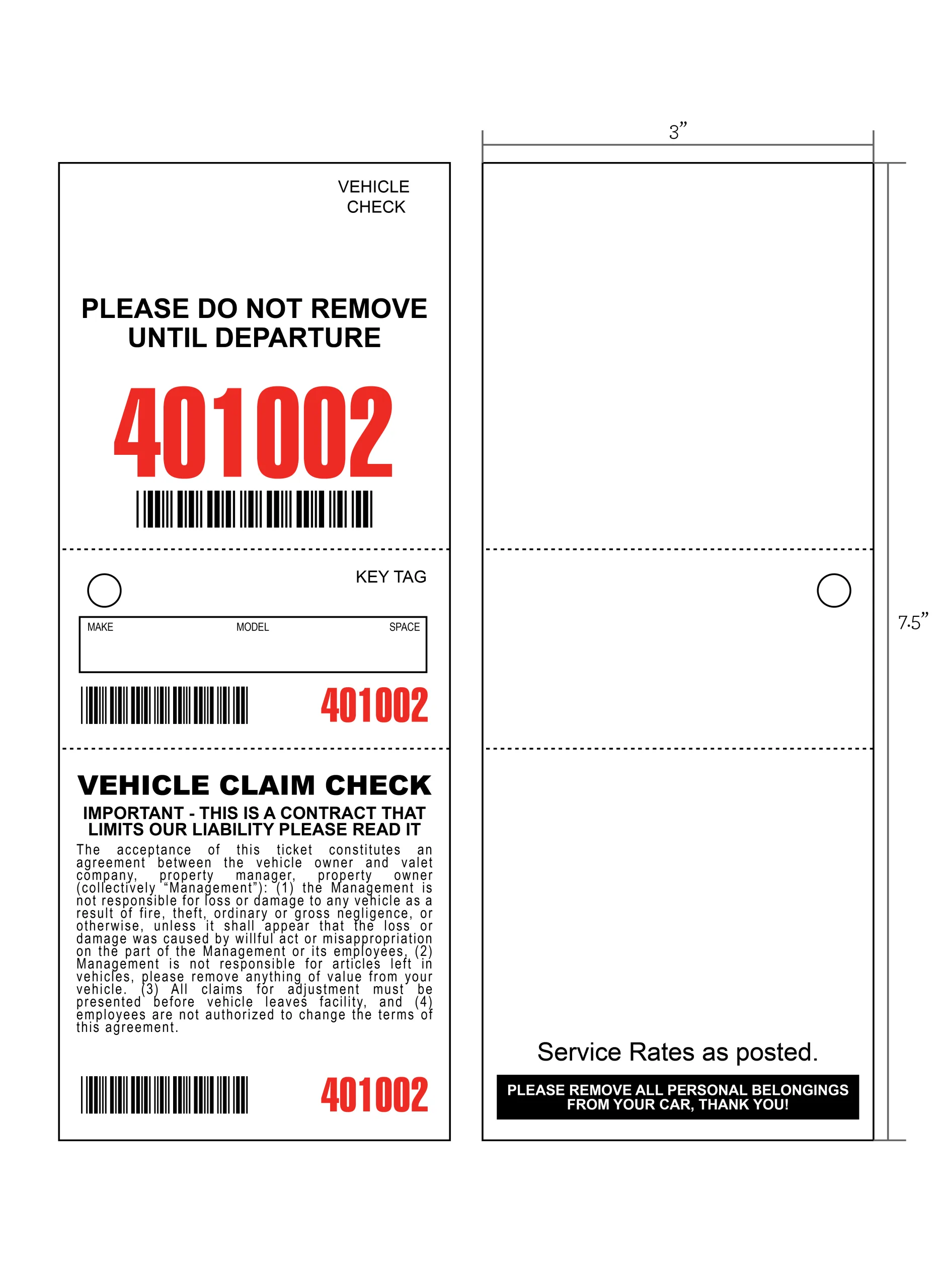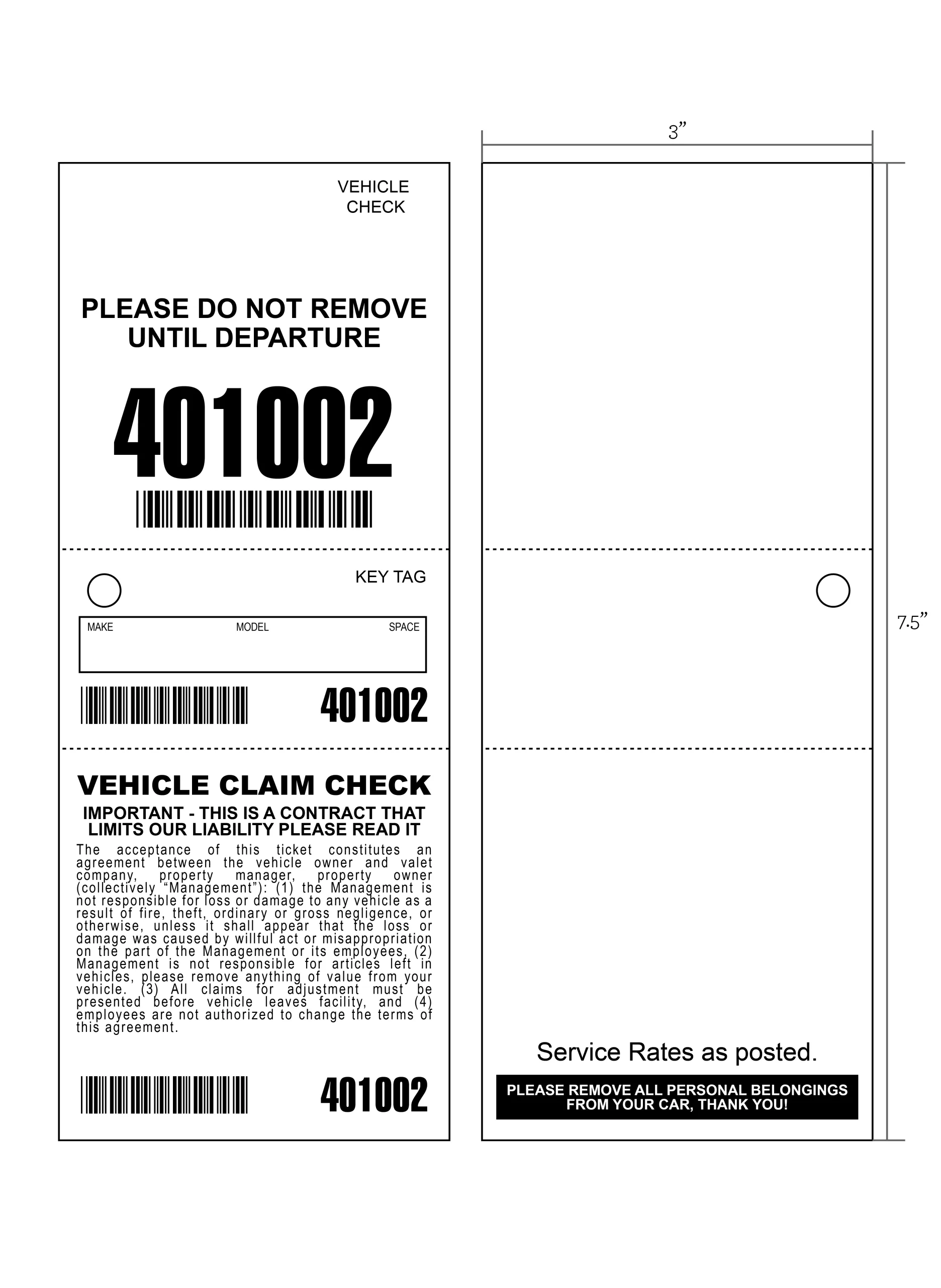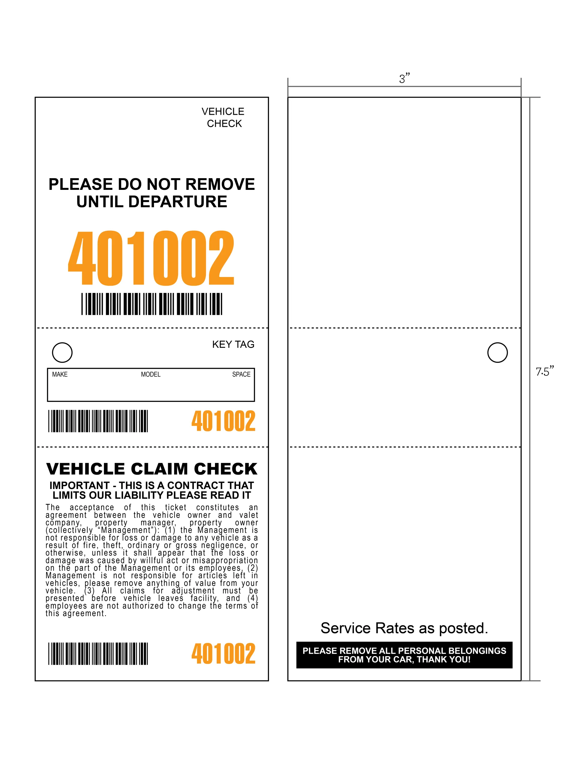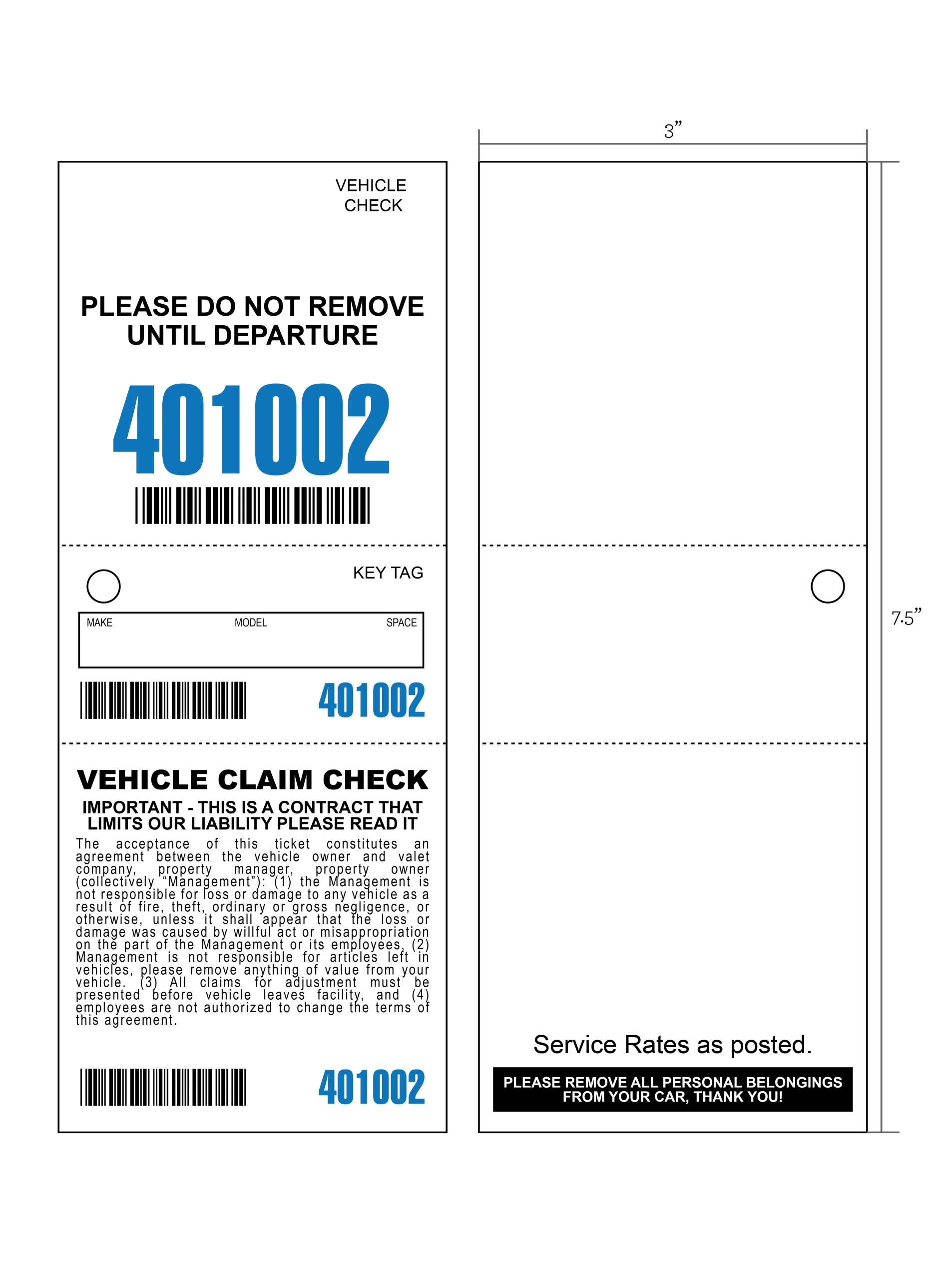 - 3 part valet tickets measure 3″ wide x 7.5″ tall
