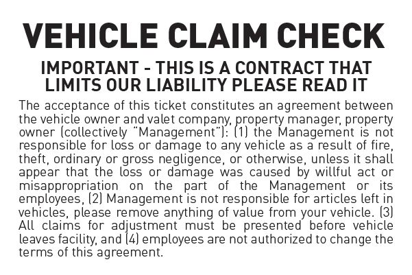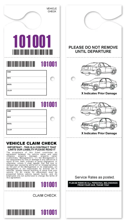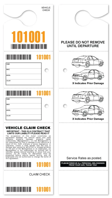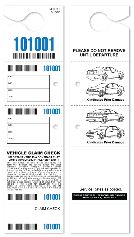 • 5 part valet tickets measure 3″ wide x 10.5″ tall