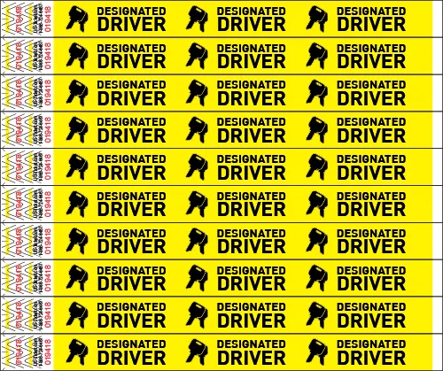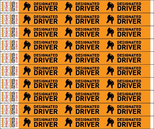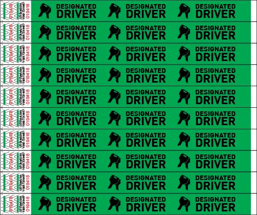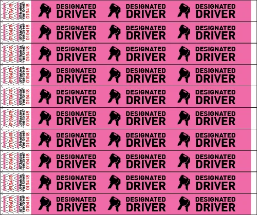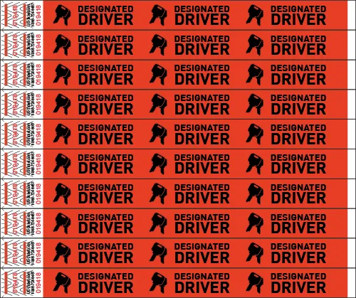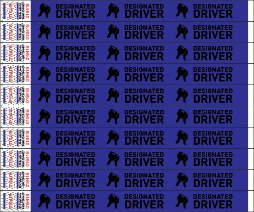 Designated Driver pattern on a 3/4″ Tyvek Wristband. Tyvek is a non-rippable, waterproof material which an be worn for several days. Tyvek Wristbands are sequentially numbered and the ends are scored to prevent taking the ticket off and reusing it.