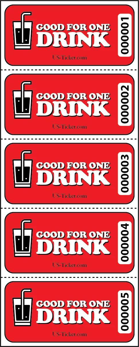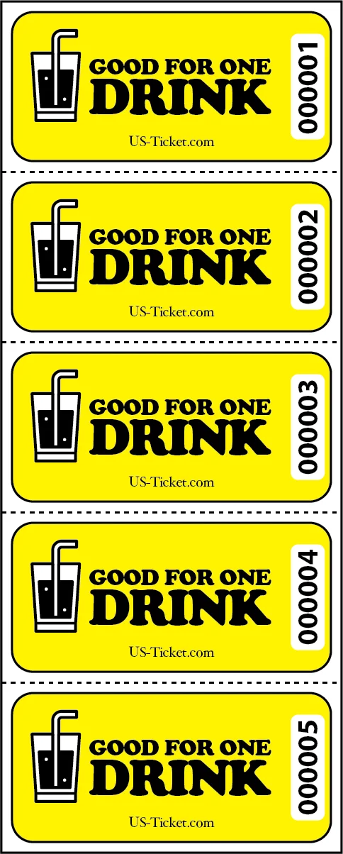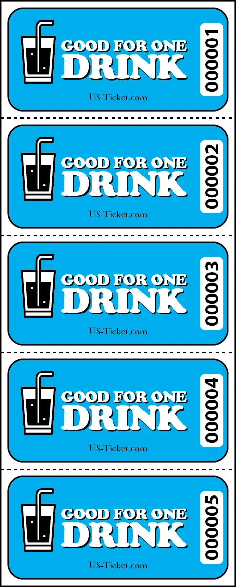 Our Good for One Drink sheet tickets are a great way to quickly distribute drink vouchers to your customers in quantity. Tickets are printed in 4 vibrant colors and each ticket is individually & consecutively numbered. Each pack contains 200 sheets of 5 tickets per pack (1,000 total tickets). Click the drop down price menu box above for additional quantities and pricing.