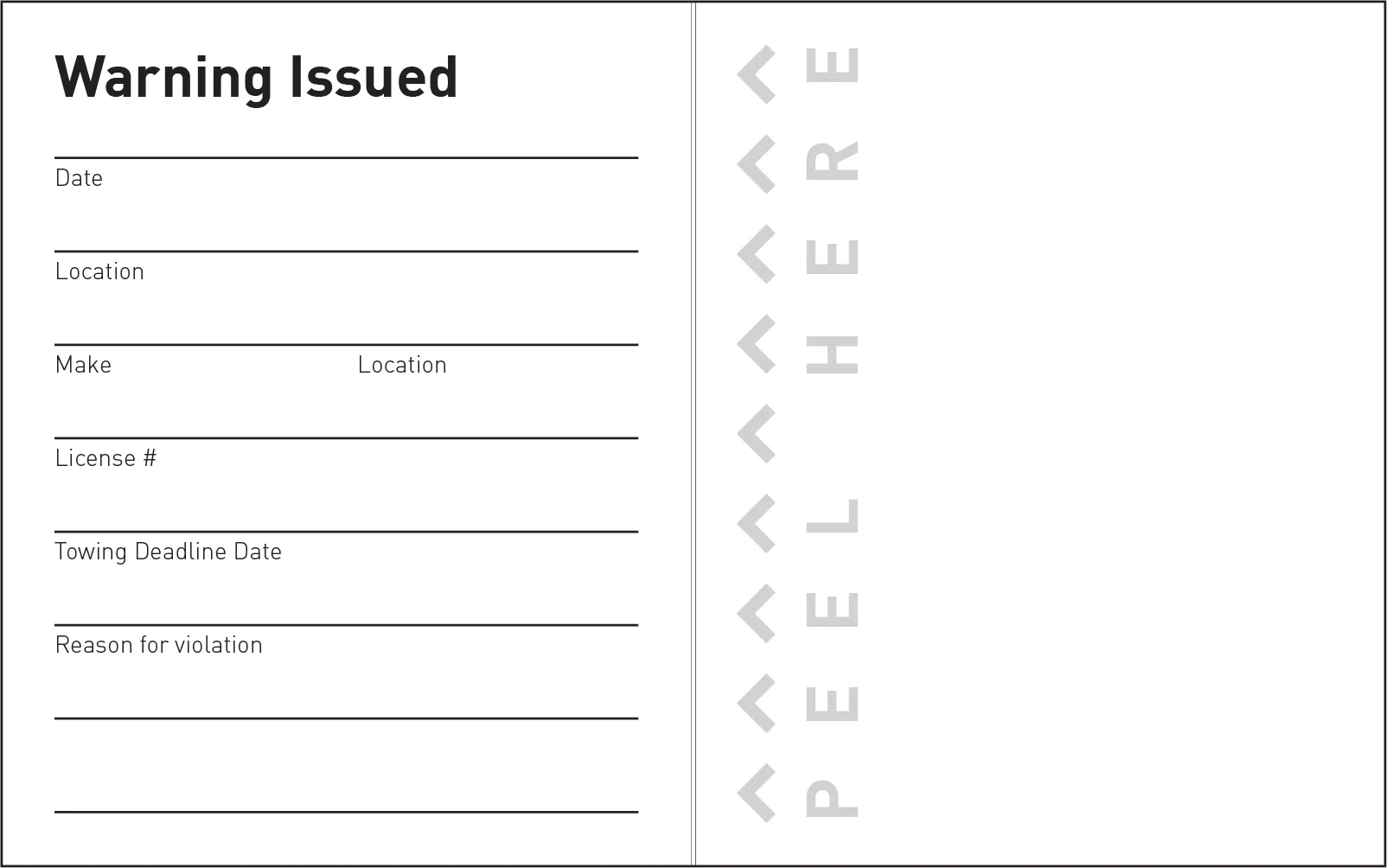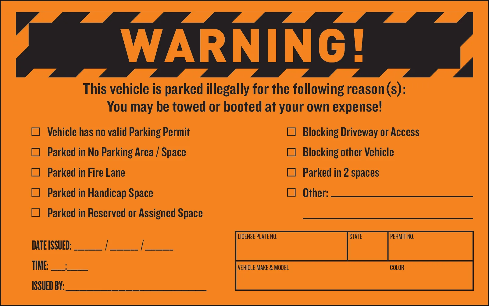 Available in 2 bright, hard to ignore colors. Paper labels are writable—use a pencil, pen or permanent marker to outline parking infractions and vehicle info. Heavy duty adhesive is hard to remove from wind shield and or surface area applied to. Printed liner on the violation sticker can be used to record the license number and date as an office record. 50 Stickers per book/ pack. Call or e-mail for quantity discounts.