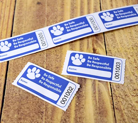 PBIS Roll Tickets are printed in bright colors on white paper stock. Each ticket contains the Paw Print logo as well as the motto “Be Safe, Be Respectful, Be Responsible.” Tickets measure 1″ by 2″ and are sequentially numbered within each roll.