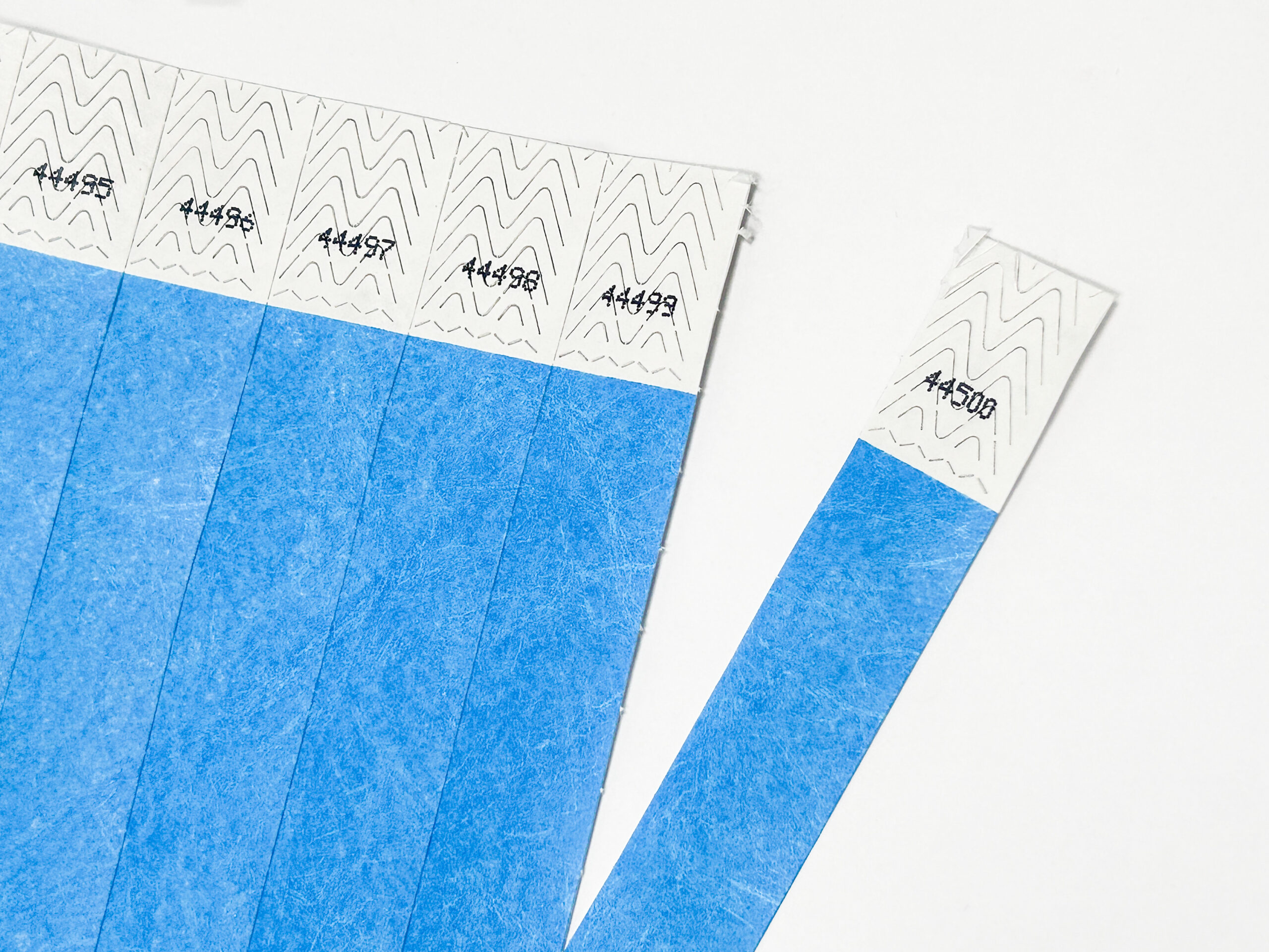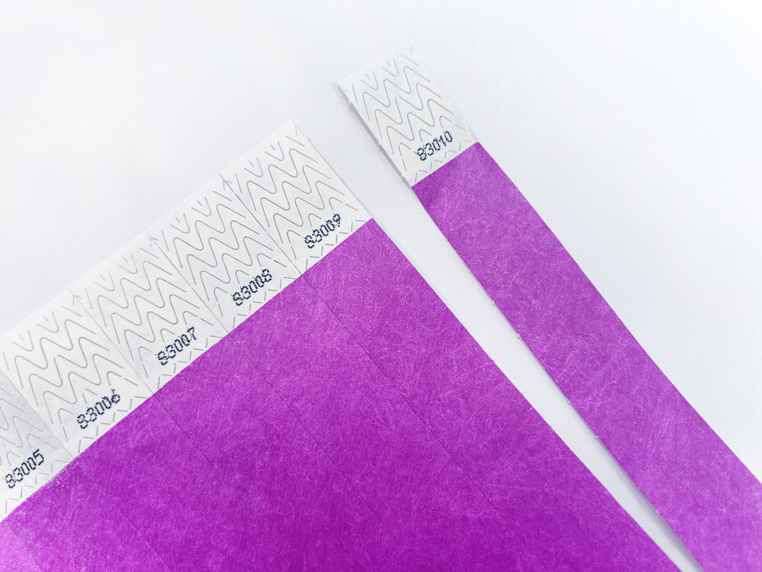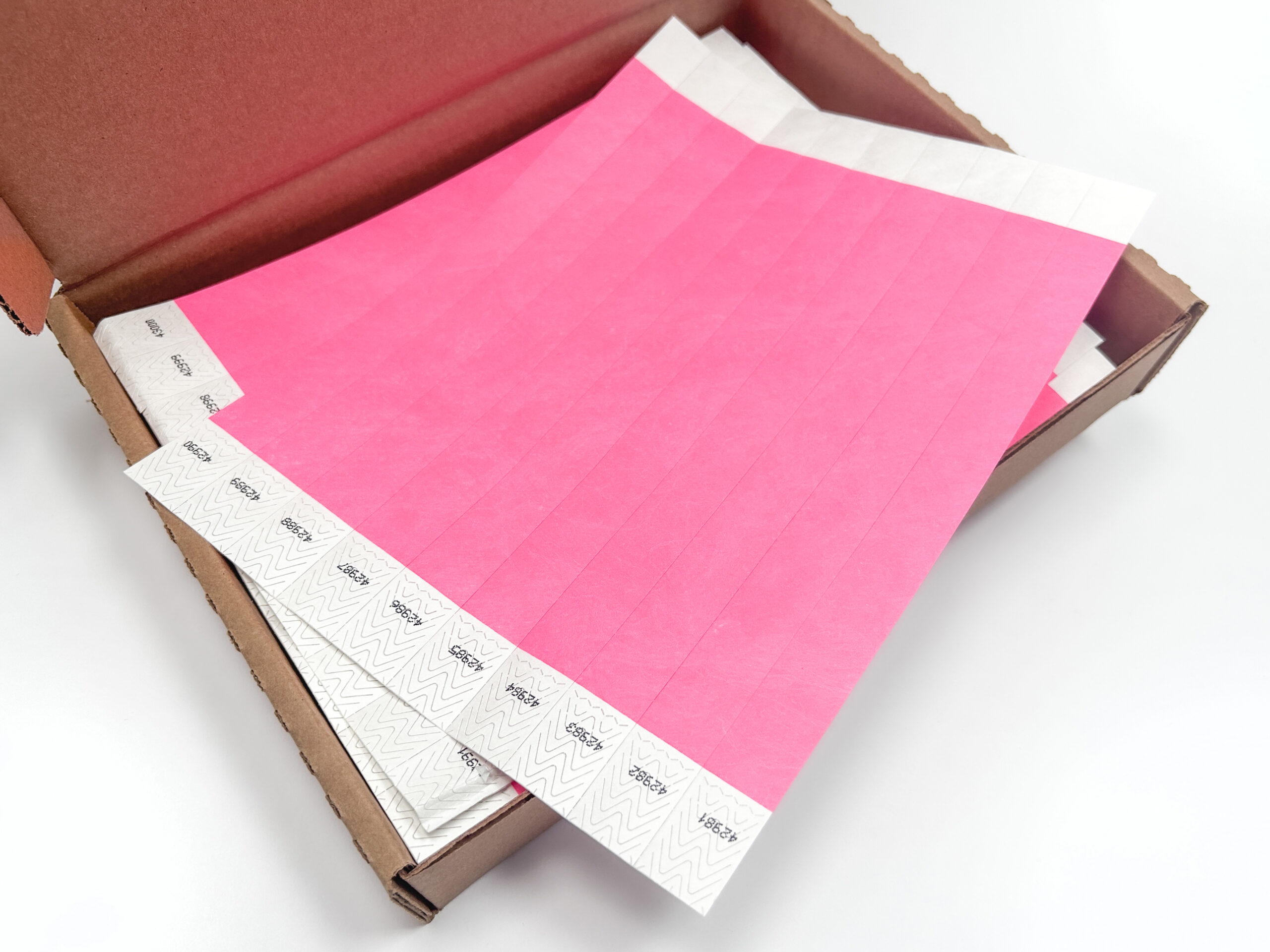 Solid Color 3/4″ Tyvek Wristband. Tyvek is a non-rippable, waterproof material which an be worn for several days. Coral red and color varieties labeled “neon” are blacklight sensitive! Tyvek Wristbands are sequentially numbered and the ends are scored to prevent taking the ticket off and reusing it.