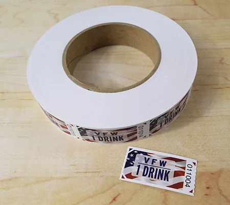 Good for 1 Dink Tickets – Premium Patriotic VFW 1 Drink Flag Roll Tickets! . 1″x2″ Ticket size.