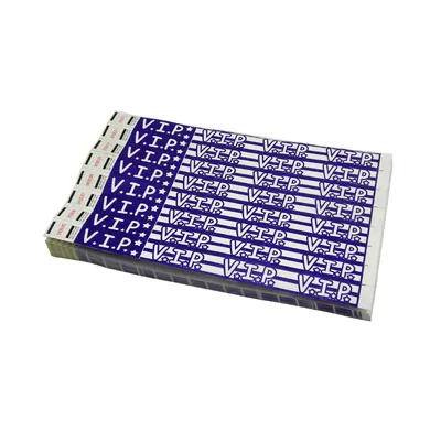 V.I.P. pattern on a 3/4″ Tyvek Wristband. Tyvek is a non-rippable, waterproof material which an be worn for several days. Tyvek Wristbands are sequentially numbered and the ends are scored to prevent taking the ticket off and reusing it.